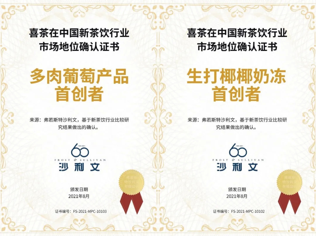 此前,全球著名的增長咨詢公司弗若斯特沙利文(Frost & Sullivan)曾先后授予喜茶“新茶飲行業(yè)多肉葡萄產(chǎn)品首創(chuàng)者”與“新茶飲行業(yè)生打椰椰奶凍首創(chuàng)者”兩項(xiàng)認(rèn)證。