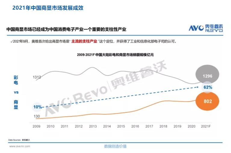 奧維云網(wǎng)(AVC)董事長(zhǎng)文建平表示,從規(guī)模變化來(lái)看,商顯行業(yè)是一個(gè)持續(xù)增長(zhǎng)的行業(yè),銷售額從2009年的130億到2021預(yù)計(jì)達(dá)到的800億,這十多年來(lái)年復(fù)合增加率接近6成。商用顯示領(lǐng)域已經(jīng)成為液晶顯示等產(chǎn)品最主要的國(guó)內(nèi)新增產(chǎn)能消化口。尤其是在5G商用網(wǎng)絡(luò)、智能社會(huì)加速到來(lái),顯示終端作為重要的信息窗口,商用顯示的應(yīng)用價(jià)值在不斷放大。