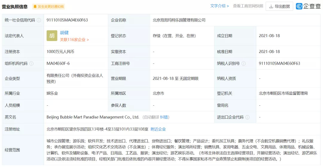 早在2021年8月份,泡泡瑪特注冊成立了北京泡泡瑪特樂園管理有限公司,注冊資金為1000萬元,其主營業(yè)務(wù)包含了城市公園管理、游樂園、游藝娛樂活動等,被視為泡泡瑪特入局主題樂園市場的正式官宣。而之所以有資本可以進入這一領(lǐng)域,也是基于其鮮明的IP屬性,相關(guān)資料顯示,泡泡瑪特共運營有93個IP,其中包括Molly、Dimoo等12個自有IP,以及PUCKY、The Monsters等25個獨家IP。