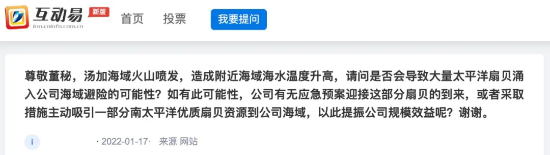 1月17日,便有投資者在深交所互動(dòng)平臺(tái)上向獐子島董秘提問(wèn)相關(guān)問(wèn)題,甚至詢問(wèn)有無(wú)緊急預(yù)案迎接大批扇貝到來(lái),或者采取主動(dòng)措施吸引南太平洋優(yōu)質(zhì)扇貝資源到公司海域,從而提振公司規(guī)模效應(yīng)。