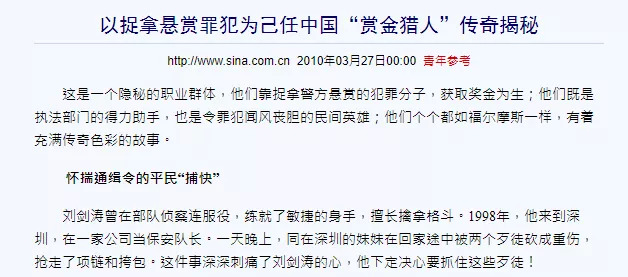 據(jù)新聞采訪,劉劍濤是北方人,曾經(jīng)在部隊(duì)偵察連服役,尤其擅長(zhǎng)擒拿格斗。1998年時(shí),因?yàn)槊妹迷谏钲谠庥鲲w車(chē)黨搶劫,憤怒讓他燃起了成為一名賞金獵人的決心: