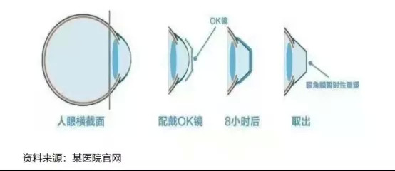 前者需要做到激光手術(shù),將眼角膜削薄,對(duì)于成長(zhǎng)發(fā)育過(guò)程中的青少年兒童來(lái)說(shuō),顯然并不適用;后者則是通過(guò)佩戴OK鏡(全名叫“角膜塑形鏡”, 英文名為Orthokeratology),通過(guò)外力把角膜的弧度壓平,從而降低屈光率,暫時(shí)提高裸眼視力。