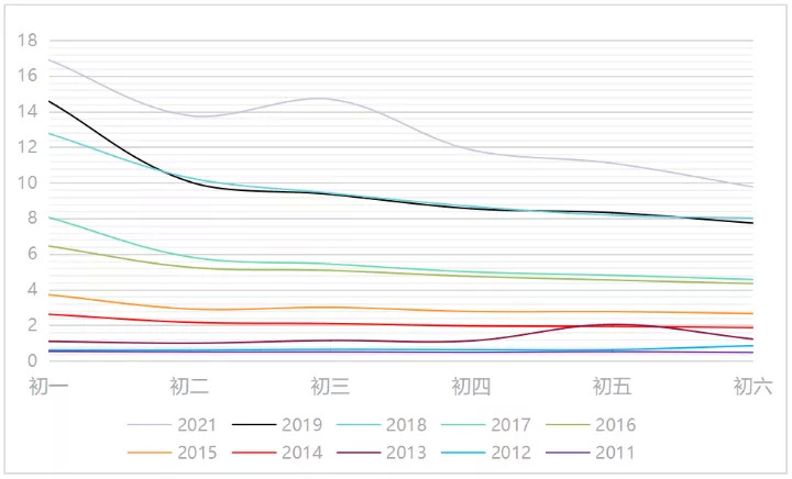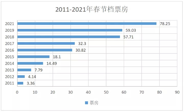 △圖2:2011-2021年春節(jié)檔走勢(shì)圖單位:億元(數(shù)據(jù)來(lái)源:貓眼專(zhuān)業(yè)版)