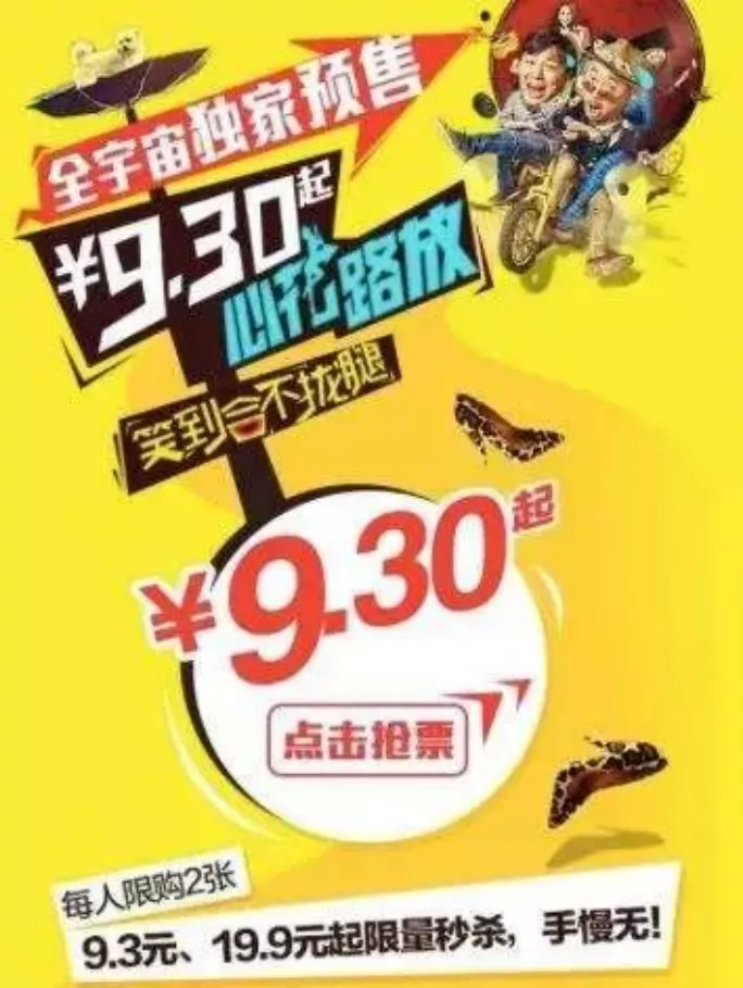 春節(jié)檔曾是票補(bǔ)大戰(zhàn)的最佳試煉場(chǎng)。2017年春節(jié)檔前夕,貓眼推出“貓眼派對(duì),一期一惠”活動(dòng),《西游伏妖篇》《功夫瑜伽》《大鬧天竺》《乘風(fēng)破浪》《熊出沒(méi)·奇幻空間》5部新片均能享受9.9元的優(yōu)惠價(jià)格。淘票票不甘落后,除《熊出沒(méi)·奇幻空間》外,新片都享受“8.8元起過(guò)大年”。格瓦拉則聯(lián)手銀行,針對(duì)《乘風(fēng)破浪》發(fā)起“5元電影票”。