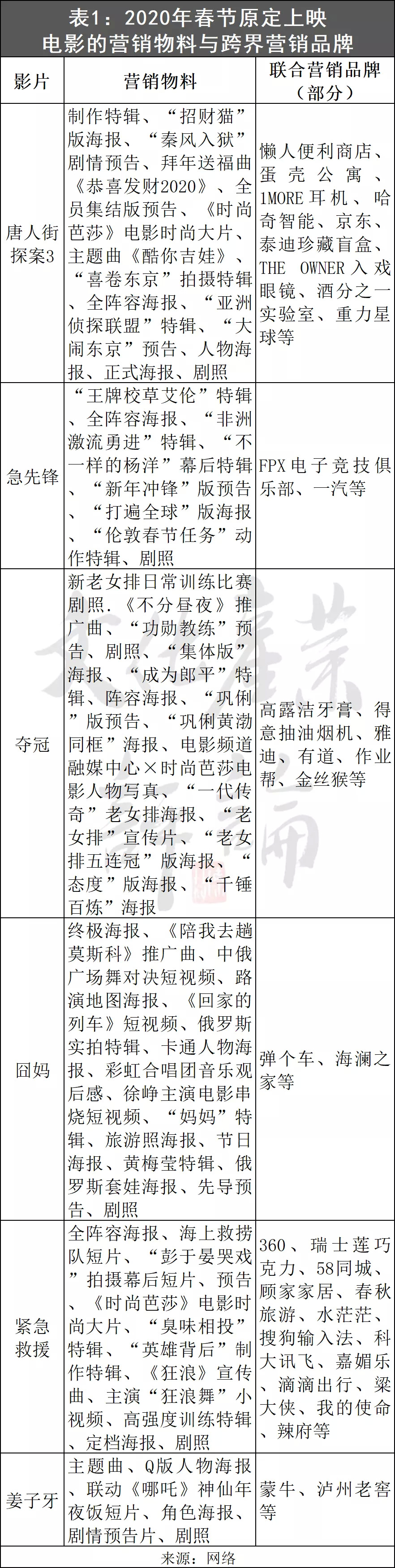 2019年的春節(jié)檔,延續(xù)了這種大力出奇跡的方式。2020年撤檔前的春節(jié)檔,在營(yíng)銷(xiāo)上也沒(méi)手軟,宣傳物料的種類(lèi)和數(shù)量更多,品牌聯(lián)合營(yíng)銷(xiāo)更上一層樓。