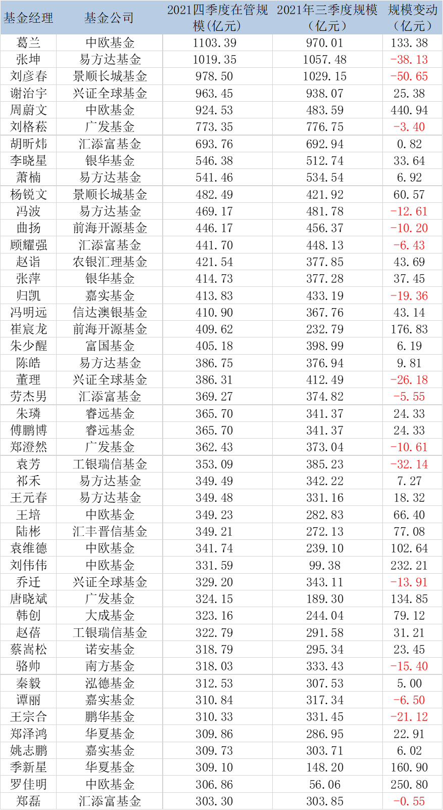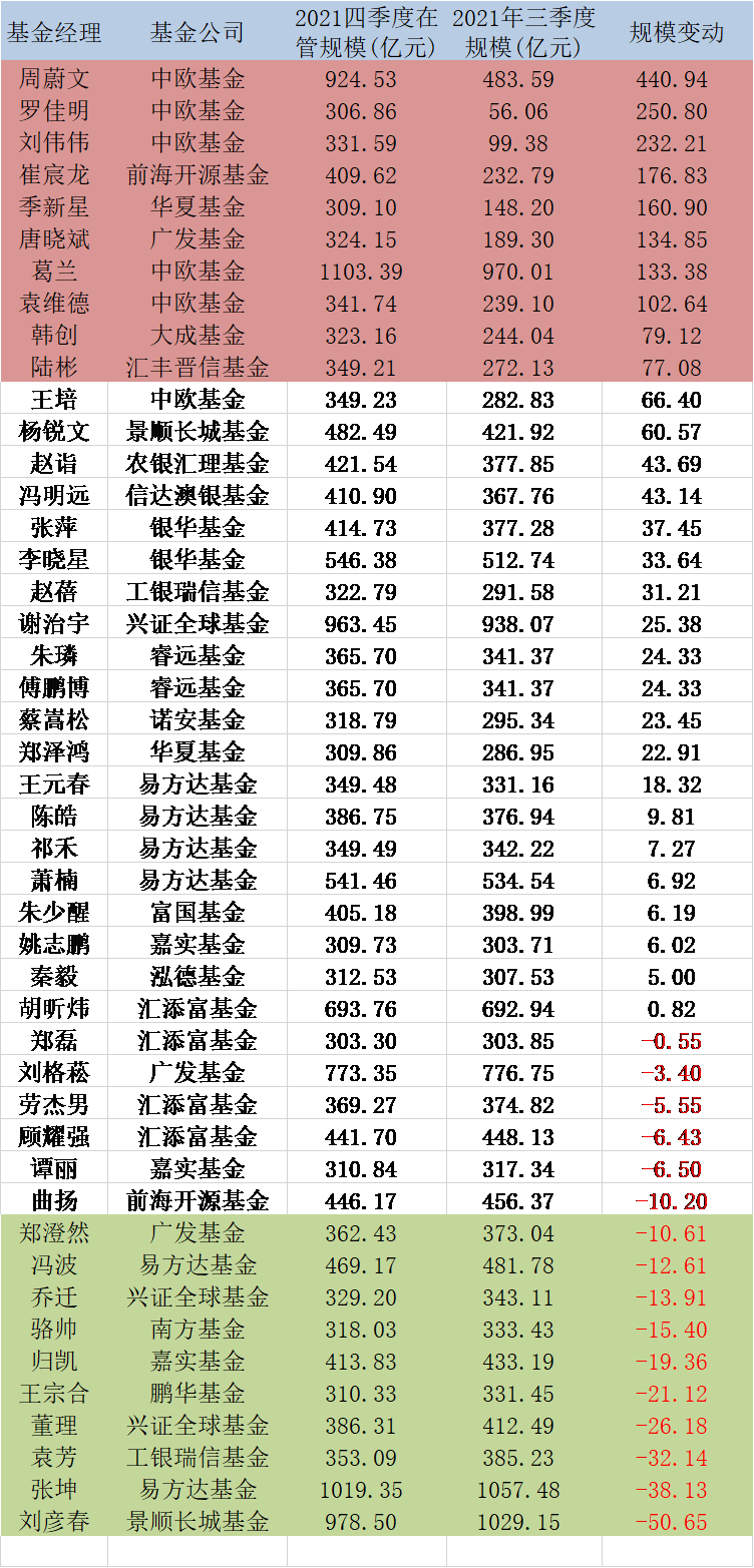 數(shù)據(jù)顯示,截至2021年末,規(guī)模在300億元以上的主動(dòng)權(quán)益基金經(jīng)理有46位,去年第四季度,30位基金經(jīng)理的管理規(guī)模有所增加,16位出現(xiàn)縮水。