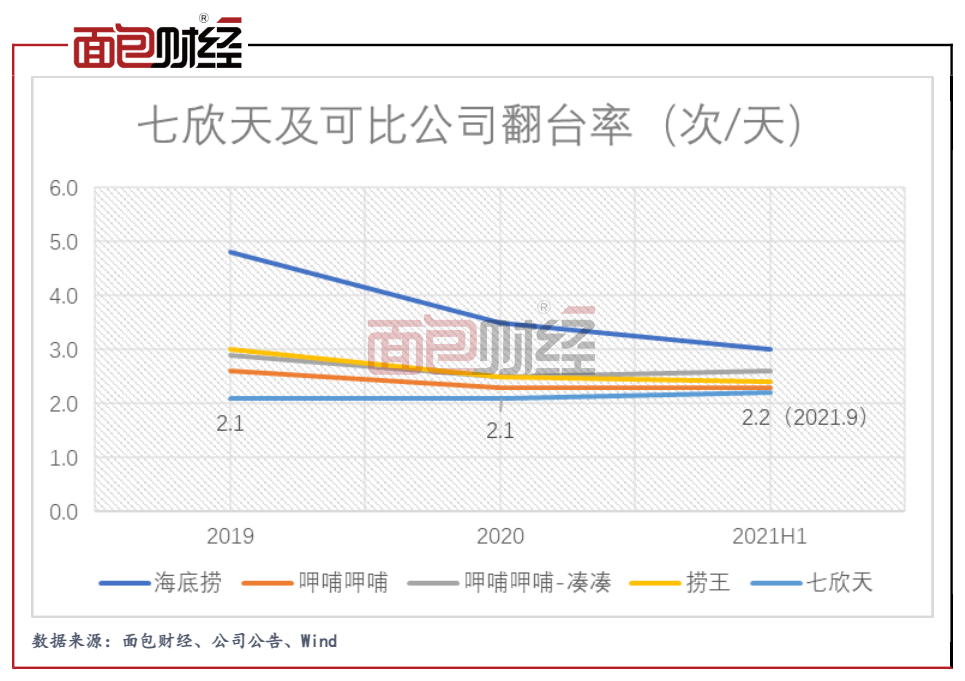 餐廳運(yùn)營(yíng)是公司收入的主要來(lái)源,其占比達(dá)到總收入的八成以上。2021年前三季度,人均客單價(jià)(堂食)為131元,較2020年同期上漲14元;堂食顧客數(shù)量達(dá)到937.75萬(wàn)名,同比增加逾30%。相比之下,餐廳的翻臺(tái)率則表現(xiàn)一般,2021年前三季度翻臺(tái)率僅為2.2次/天,公司近2年的翻臺(tái)率在可比公司中墊底。