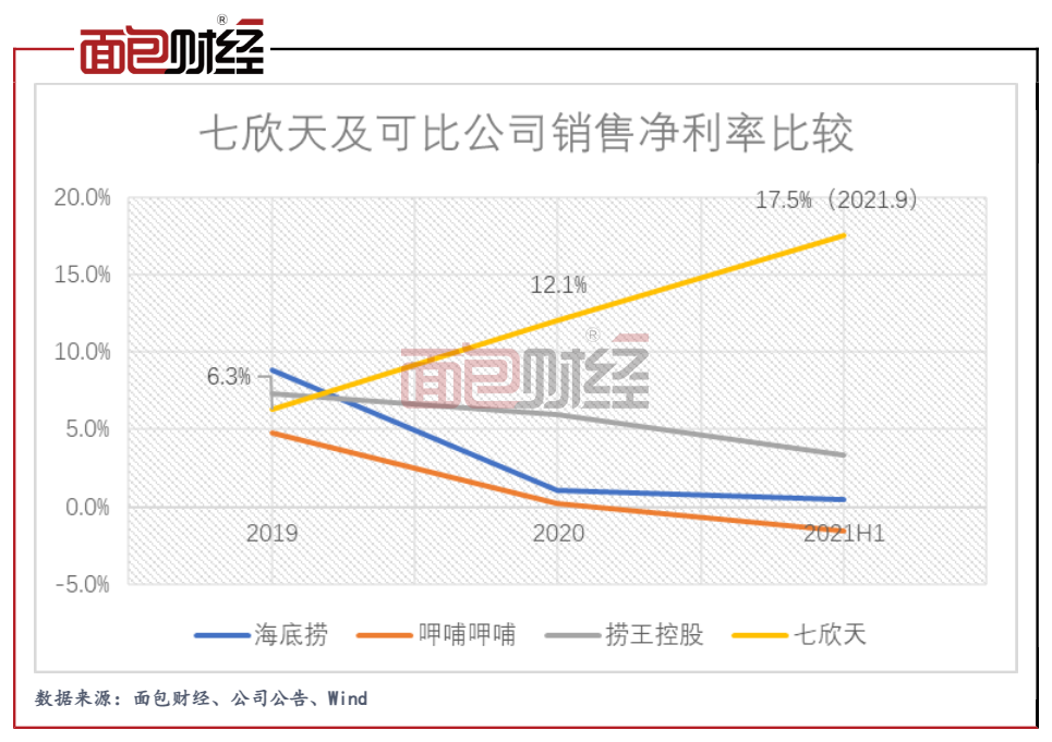 2020年以來(lái)在疫情影響下,餐飲行業(yè)整體經(jīng)營(yíng)并不景氣,近兩年頭部火鍋企業(yè)的利潤(rùn)率呈下降趨勢(shì)。相比之下,七欣天的凈利率反倒逆市大增,從2019年的6.3%增至2021年9月末的17.5%,超過(guò)可比公司逾10個(gè)百分點(diǎn)。截至2021年9月30日,公司累計(jì)實(shí)現(xiàn)收入14.8億元,同比增長(zhǎng)49.4%;凈利潤(rùn)2.59億元,同比增長(zhǎng)161.8%。