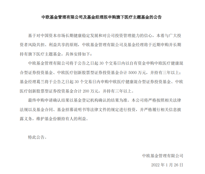 今日,中歐基金發(fā)布公告,稱公司將于公告之日起30個交易日內以自有資金申購中歐醫(yī)療健康混合型證券投資基金(以下簡稱“中歐醫(yī)療健康基金”)、中歐醫(yī)療創(chuàng)新股票型證券投資基金(以下簡稱“中歐醫(yī)療創(chuàng)新基金”)合計5000萬元,并持有三年以上。與此同時,基金經(jīng)理葛蘭也將于公告之日起30個交易日內以自有資金自購中歐醫(yī)療健康基金、中歐醫(yī)療創(chuàng)新基金合計200萬元,并持有三年以上。