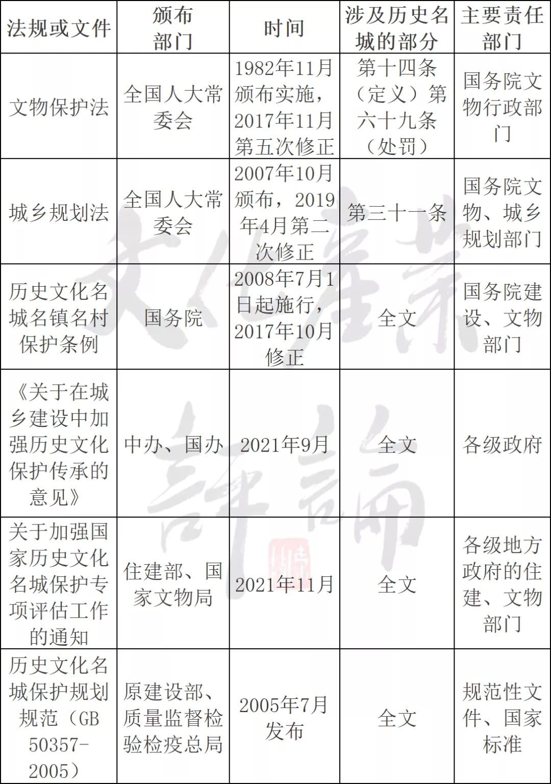 1982年2月我國頒布了第一批國家歷史文化名城名單,1982年11月通過的《文物保護(hù)法》明確對國家歷史文化名城進(jìn)行了定義,之后有多部法律法規(guī)與重要文件涉及此事。(見下表)