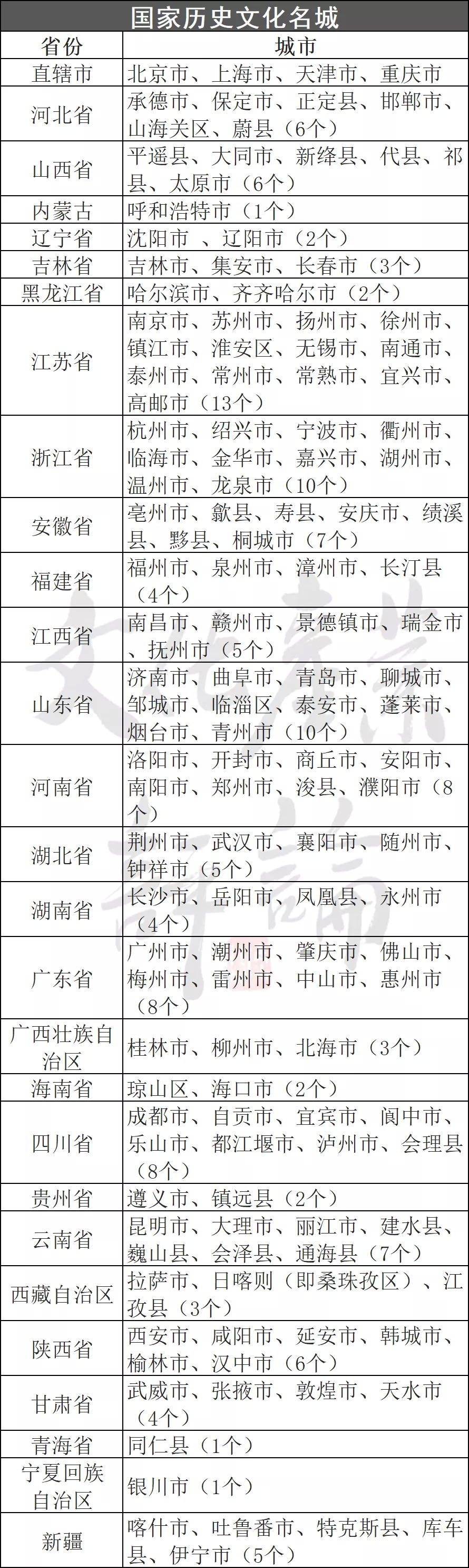 除了臺灣省以及香港、澳門兩個特別行政區(qū),全國其他的所有省級行政區(qū)都有至少一個國家歷史文化名城。