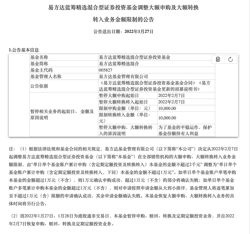 1月27日傍晚,易方達(dá)基金發(fā)布公告稱(chēng),為了基金的平穩(wěn)運(yùn)作,保護(hù)基金份額持有人利益,決定從2月7日起調(diào)整易方達(dá)藍(lán)籌精選在全部銷(xiāo)售機(jī)構(gòu)的大額申購(gòu)、大額轉(zhuǎn)換轉(zhuǎn)入業(yè)務(wù)金額限制,由“單日單個(gè)基金賬戶(hù)累計(jì)申購(gòu)(含定期定額投資及轉(zhuǎn)換轉(zhuǎn)入)本基金的金額不超過(guò)2千元”調(diào)整為“單日單個(gè)基金賬戶(hù)累計(jì)申購(gòu)(含定期定額投資及轉(zhuǎn)換轉(zhuǎn)入,下同)本基金的金額不超過(guò)1萬(wàn)元”。