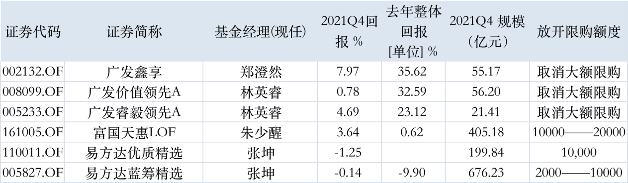 今日,鄭澄然管理的廣發(fā)鑫享和林英睿管理的廣發(fā)睿毅領(lǐng)先、廣發(fā)價(jià)值領(lǐng)先三只基金也宣布將于2022年1月28日起解除申購(gòu)限制。