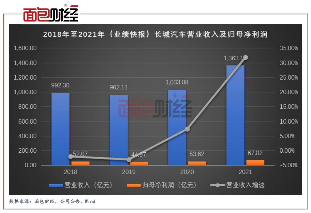 長城汽車2021年實現(xiàn)營業(yè)收入1363.17億元,同比增長31.95%;實現(xiàn)歸母凈利潤67.82億元,同比增長26.47%;實現(xiàn)扣非歸母凈利潤42.89億元,同比增長11.8%。