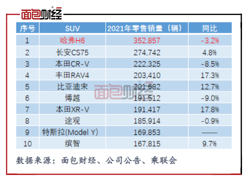 哈弗品牌全年實現(xiàn)批發(fā)銷量77萬輛,同比增長2.64%。在乘聯(lián)會發(fā)布的1-12月國內(nèi)SUV零售銷量排行榜中,哈弗H6車型以35.29萬輛的零售銷量居榜首,但較上年銷量下滑3.2%。