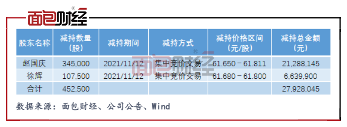 ?在公司股價創(chuàng)歷史新高后,2021年11月12日,公司副總經(jīng)理趙國慶、董事會秘書徐輝通過集中競價方式減持公司股份45.25萬股,減持總金額逾2792萬元。