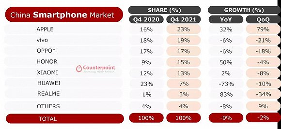 中國市場上,據(jù)Counterpoint最新發(fā)布的數(shù)據(jù)顯示,2021年第四季度,小米的市場份額僅為13%,排名第五位,銷量同比下滑8%。