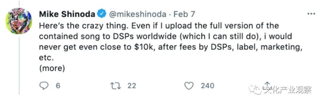 去年2月,Linkin Park 聯(lián)合創(chuàng)始人Mike Shinoda通過(guò)NFT銷售賺取10,000美元,其隨后發(fā)布推特稱:“即使我將包含歌曲的完整版本上傳到全球的DSP(數(shù)字流媒體平臺(tái)),扣除DSP、唱片公司和營(yíng)銷費(fèi)用后,我的收入也永遠(yuǎn)不會(huì)接近10,000美元?!?/p>