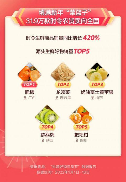 抖音則抖音圍繞“國潮出新,年味到家”的主題,推出了“壬寅迎新”“匠心年味”“國貨好禮”“源頭特產(chǎn)”四個版塊,同時還特設(shè)了“家鄉(xiāng)年貨節(jié)”專場。其相關(guān)數(shù)據(jù)顯示,在年貨節(jié)期間,抖音電商上線了31.9萬款時令農(nóng)貨,生鮮類農(nóng)特產(chǎn)銷量同比增長420%。
