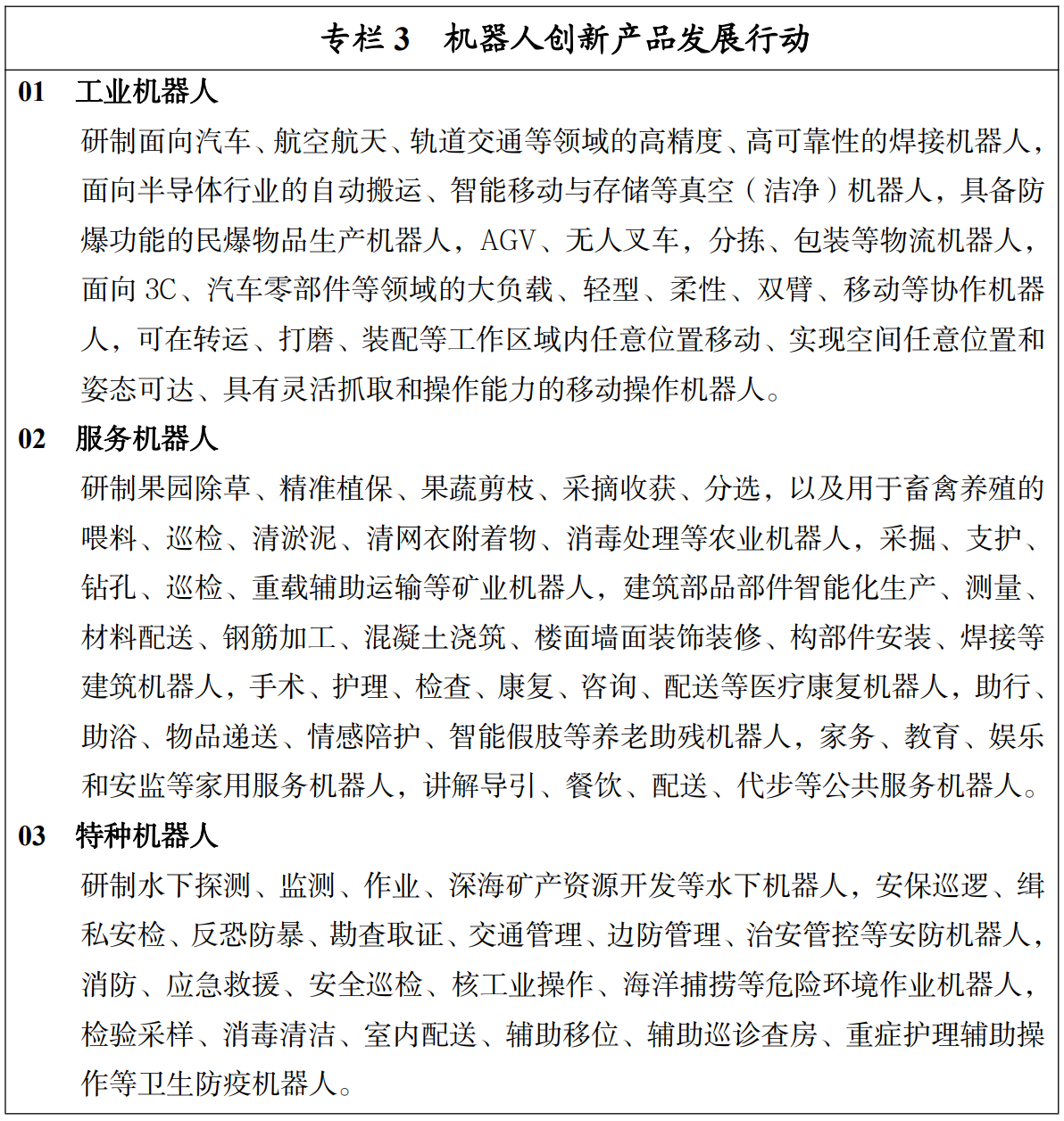 服務(wù)機(jī)器人方面,提出針對(duì)果園、畜禽養(yǎng)殖的農(nóng)業(yè)機(jī)器人,礦業(yè)機(jī)器人,建筑機(jī)器人,醫(yī)療康復(fù)機(jī)器人,養(yǎng)老助殘機(jī)器人、以及公共服務(wù)機(jī)器人等。