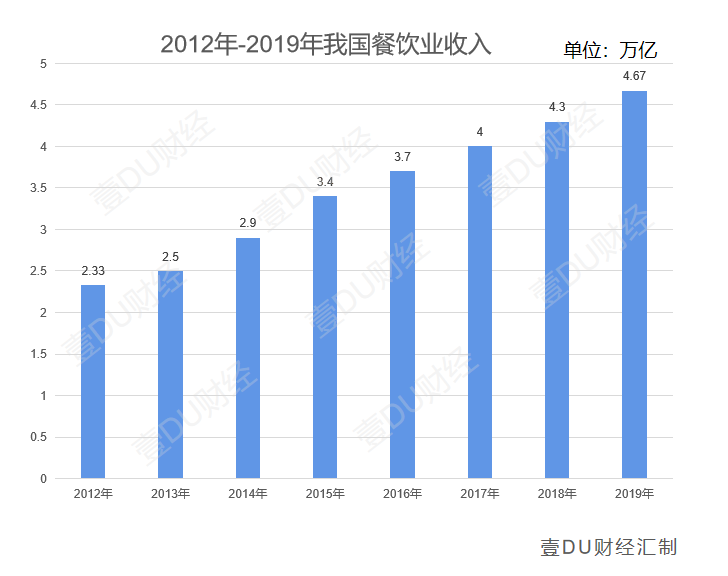 我國預(yù)制菜的興起,背后主要得益于餐飲業(yè)和外賣的快速發(fā)展。2012-2019年,我國餐飲收入從2.33萬億元上升至4.67萬億元,年復(fù)合增速達到10.44%,高于GDP增速。