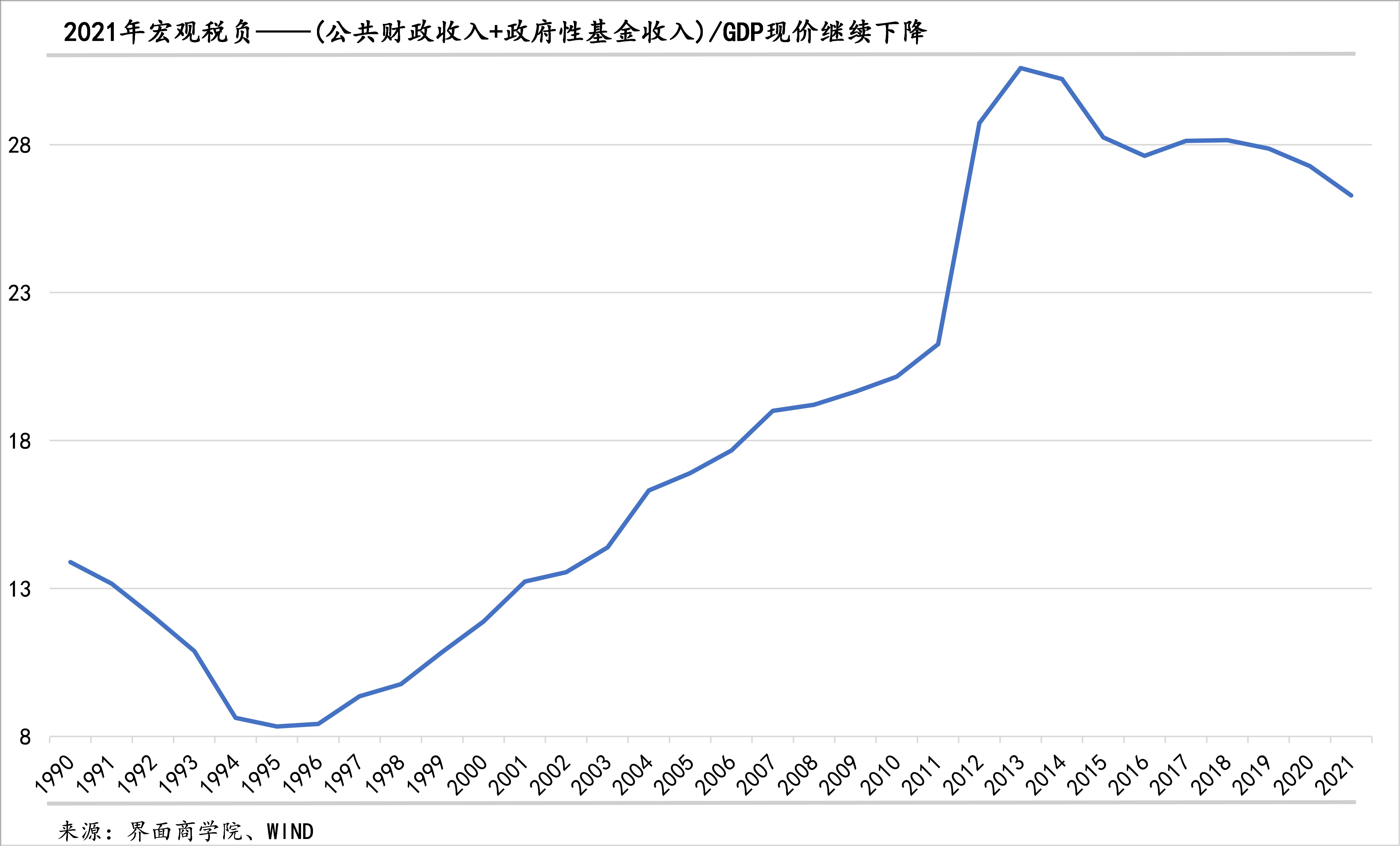宏觀稅負(fù)可能會(huì)延續(xù)2020年、2021年的下降態(tài)勢(shì)。如果將宏觀稅負(fù)限定為廣義財(cái)政收入,也就是全國(guó)公共財(cái)政收入+全國(guó)政府性基金收入(不考慮社?;鸷蛧?guó)有資本收入),那么,2021年廣義財(cái)政收入(全國(guó)公共財(cái)政收入+全國(guó)政府性基金收入)占GDP的比重較上年下降了1個(gè)百分點(diǎn)至26.3%,延續(xù)了下降態(tài)勢(shì)。