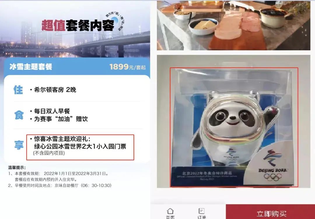 不久前,北京兩家酒店都推出了冰墩墩手辦。像北京王府井希爾頓酒店,預(yù)訂2188元兩晚的京喜冬日套餐,或者通過(guò)門(mén)市價(jià),預(yù)訂風(fēng)格套房及以上房型,就可以直接拿到驚喜冰雪主題歡迎禮。而北京通州北投希爾頓酒店,則是購(gòu)買(mǎi)2晚1899元的京喜冬日套餐,同樣贈(zèng)送冰雪主題小禮品。