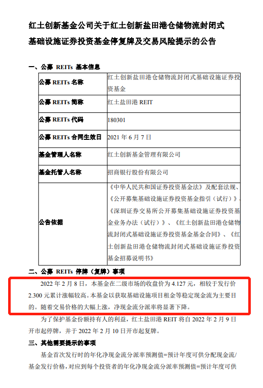 公告解釋稱,因為基金以獲取基礎(chǔ)設(shè)施項目租金等穩(wěn)定現(xiàn)金流為主要目的,隨著交易價格的大幅上漲,凈現(xiàn)金流分派率將顯著下降。