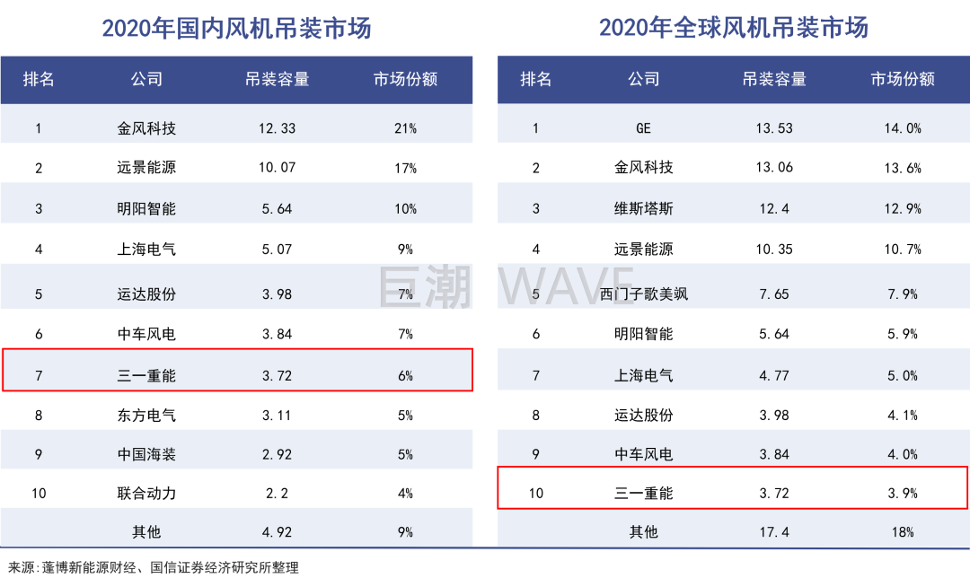 根據(jù)彭博新能源財(cái)經(jīng)統(tǒng)計(jì),2020年三一重能新增裝機(jī)3.72GW,排名全球總量第10、陸上第9;國(guó)內(nèi)則位居新增裝機(jī)總量第7、陸上第6。
