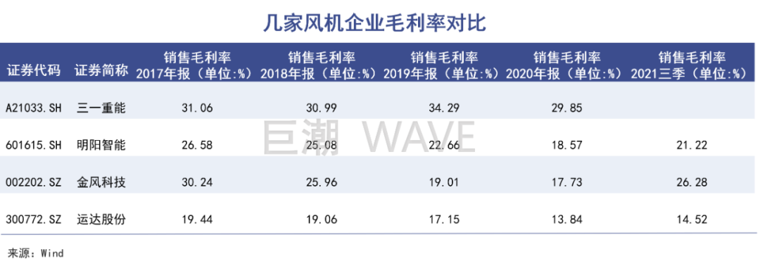 自產(chǎn)核心零部件,降低了外購成本,提升了盈利能力。2017-2020年,三一重能的毛利率均高于主要競(jìng)爭(zhēng)對(duì)手。