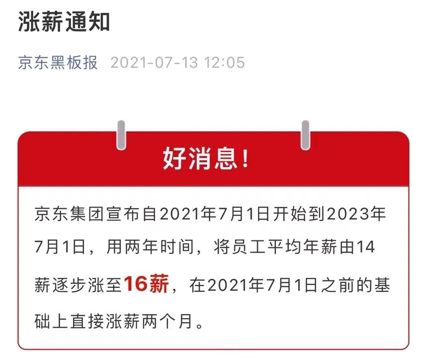 上述員工提及的“公告”,實(shí)則是京東集團(tuán)在2021年7月13日宣布的“漲薪通知”——自2021年7月1日開始到2023年7月1日,用兩年時(shí)間,將員工平均年薪由14薪逐步漲至16薪,在2021年7月1日之前的基礎(chǔ)上直接漲薪兩個(gè)月。