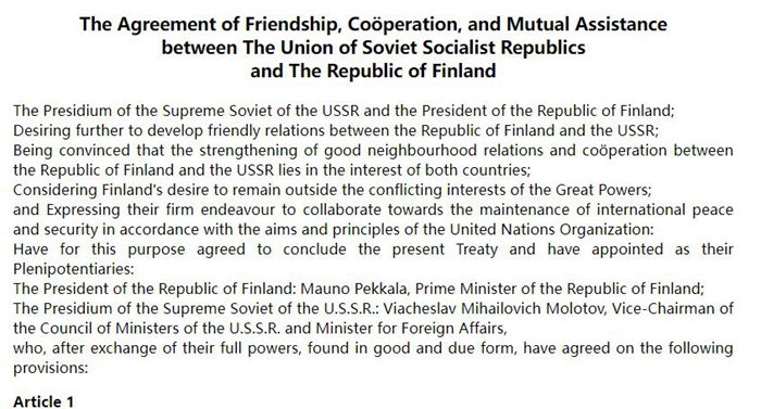 1948年4月,為防止西方國家通過芬蘭發(fā)起進(jìn)攻,蘇聯(lián)與芬蘭簽訂了《蘇芬友好合作互助條約》,這份條約得以讓芬蘭在冷戰(zhàn)中成為中立國。