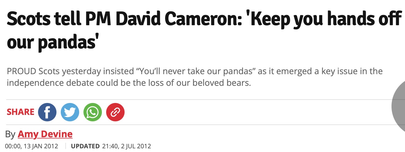 對熊貓的熱愛并非日本人獨有。2013年,在比利時,因為從中國租借的熊貓被安置在比利時南部的動物園,素來不和的南部法語區(qū)和北部荷蘭語區(qū)之間再度出現(xiàn)政治斗爭。無獨有偶,2014年蘇格蘭獨立公投時,熊貓的歸屬也成為一大問題——當(dāng)時住在蘇格蘭愛丁堡動物園的熊貓“天天”和“楊光”實際上是由中國贈送給英國政府的,蘇格蘭獨立后應(yīng)歸還熊貓,當(dāng)時的一則新聞標(biāo)題是這樣的:“Scots Tell PM David Cameron: ‘Keep You Hands Off Our Pandas’”(蘇格蘭人告訴卡梅倫:不要碰我們的熊貓)。