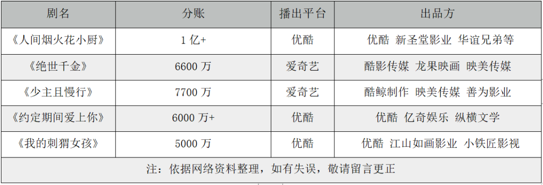 2019年至2020年全網(wǎng)分賬收益超5000萬(wàn)的5部劇中,有3部來(lái)自優(yōu)酷,2部來(lái)自愛奇藝。其中,優(yōu)酷《人間煙火花小廚》為2020年度的分賬劇冠軍,《絕世千金》以6600萬(wàn)分賬收益拿下2019年的年冠。