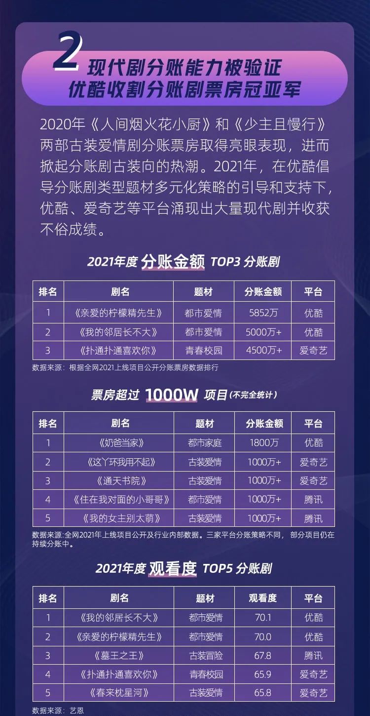 據(jù)《優(yōu)酷內(nèi)容開放平臺(tái)2021年度報(bào)告》(下文簡(jiǎn)稱《報(bào)告》),平臺(tái)《親愛的檸檬精先生》《我的鄰居長(zhǎng)不大》分別以5852萬(wàn)、5000萬(wàn)+分賬收益斬獲2021年度分賬劇票房TOP1、TOP2,愛奇藝《撲通撲通喜歡你》以4500萬(wàn)+分賬收益占據(jù)TOP3。