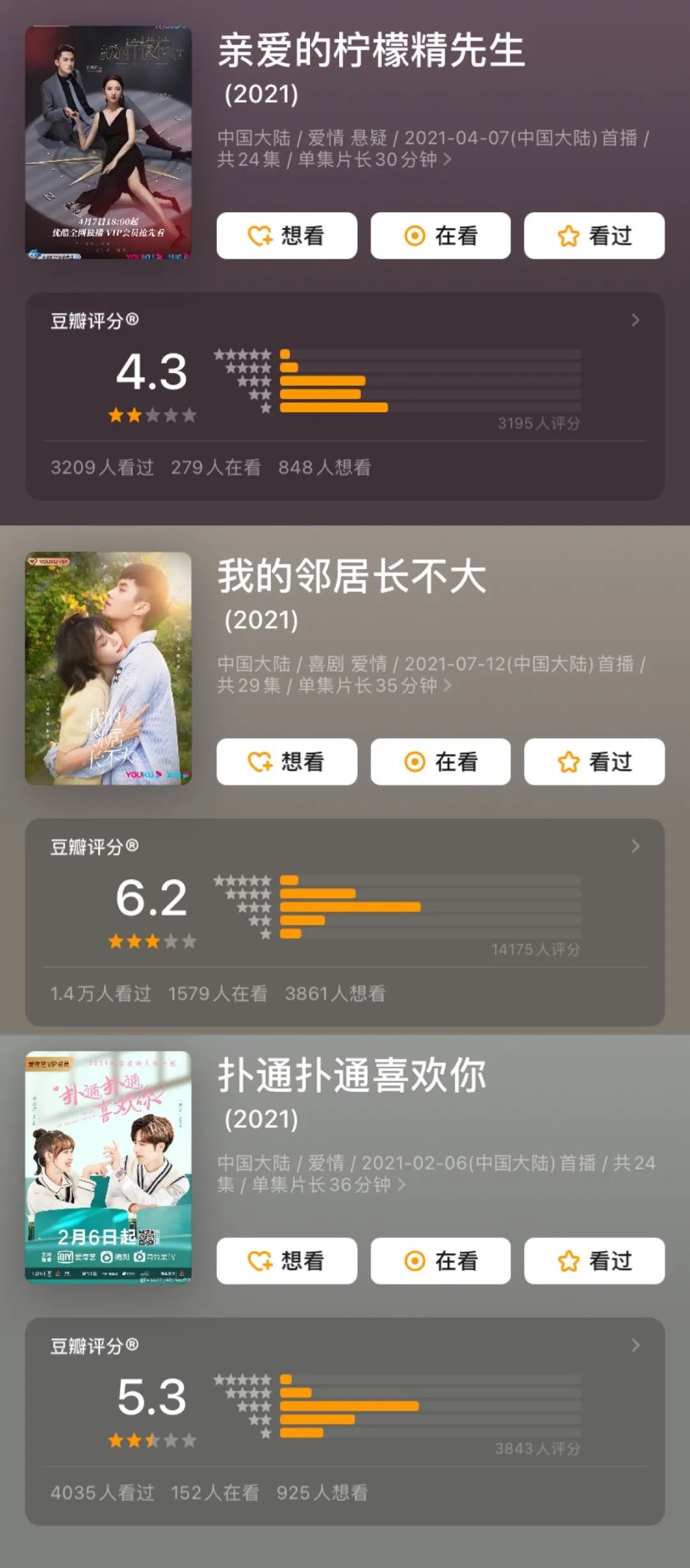 不僅如此,處于年度TOP3的《我親愛的檸檬精先生》《我的鄰居長(zhǎng)不大》《撲通撲通喜歡你》中,只有《我的鄰居長(zhǎng)不大》豆瓣評(píng)分勉強(qiáng)過(guò)6分。