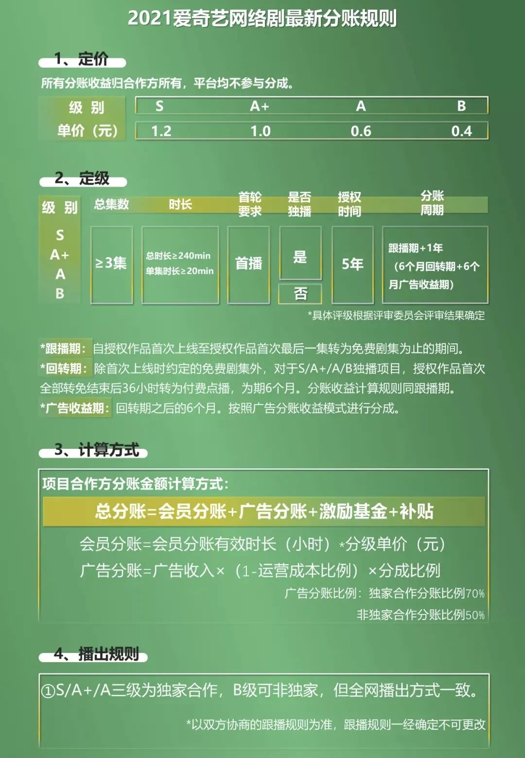 據(jù)愛奇藝在2021年12月1日起推出的全新分賬規(guī)則,平臺(tái)將此前基于會(huì)員點(diǎn)擊分賬的會(huì)員分賬收益判定轉(zhuǎn)變?yōu)闀?huì)員觀看時(shí)長(zhǎng)分賬,項(xiàng)目合作方獲得廣告分賬比例分為獨(dú)家分賬比例7:3,非獨(dú)家合作方分賬比例5:5。