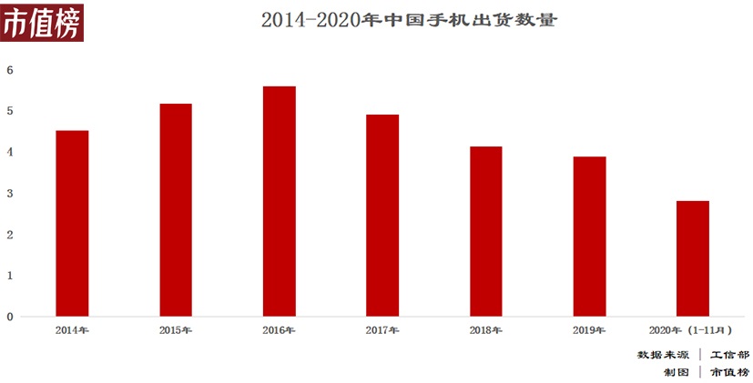 信通院數(shù)據(jù)顯示,2017年國內手機市場出貨量為4.91億部,同比下降12.3%,再到2018年前11個月,出貨量是3.79億部,同比下降15.6%。