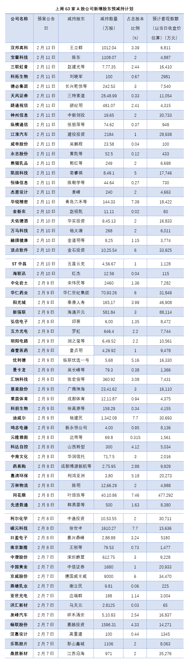 上周(2月7日至2月13日),A股公司預(yù)減持規(guī)模有所增加。據(jù)界面新聞不完全統(tǒng)計(jì),共有63家A股公司披露股東減持計(jì)劃。