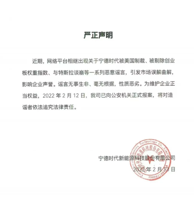 為維護(hù)企業(yè)正當(dāng)權(quán)益,2022年2月12日,寧德時(shí)代已向公安機(jī)關(guān)報(bào)案,將對(duì)造謠者依法追究法律責(zé)任。