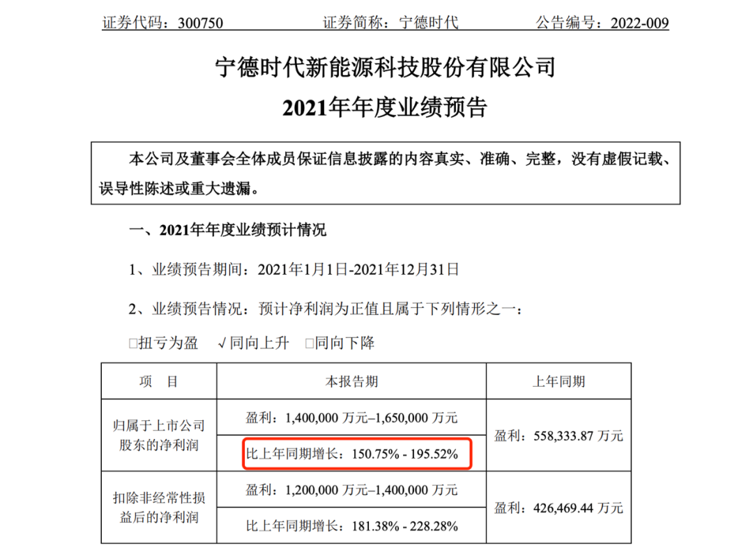 1月28日,春節(jié)前的最后一個(gè)交易日,寧德時(shí)代發(fā)布業(yè)績(jī)預(yù)告,預(yù)計(jì)2021年歸母凈利潤140-165億元,同比增長150.75%-195.52%,遠(yuǎn)超市場(chǎng)預(yù)期。