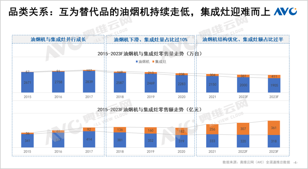 一降一升之間,集成灶對(duì)油煙機(jī)的替代效應(yīng)清晰可見。