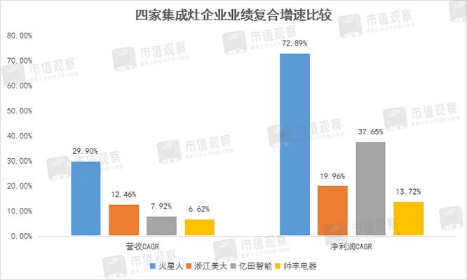 具體而言,2018年-2020年,火星人凈利潤(rùn)年復(fù)合增速高達(dá)72.89%,億田智能次之為37.65%;浙江美大與帥豐電器凈利潤(rùn)復(fù)合增速分別為19.96%與13.72%。