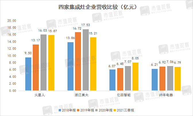 營(yíng)收規(guī)模方面,2020年,浙江美大與火星人兩家營(yíng)收進(jìn)入到15-20億元的梯度,億田智能與帥豐電器營(yíng)收則處在5-10億元的梯度。