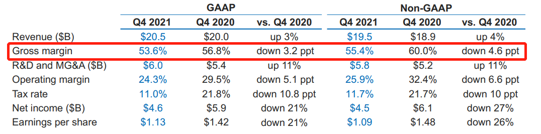 價值研究所(ID:jiazhiyanjiusuo)也觀察到,綜合華爾街多家頂級投行對高塔半導(dǎo)體2022年業(yè)績預(yù)期來看,其毛利率預(yù)計不會高于30%。而過去幾個季度,英特爾的毛利率都不低于50%,四季度的最新數(shù)據(jù)是55.4%——這還是在同比下滑4.6%的情況下取得的成績。