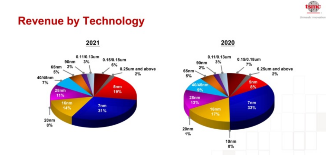數(shù)據(jù)顯示,代表當(dāng)前晶圓代工最高水平的5nm和7nm先進制程晶圓,已經(jīng)成為臺積電主要營收支柱,產(chǎn)能大幅提升。從過去兩個季度的財報來看,7nm制程晶圓代工是臺積電最賺錢的業(yè)務(wù),三季度營收占比高達52%。不過5nm制程晶圓的貢獻率也在穩(wěn)步提升中,過去兩個季度占比分別為18%和19%,較去年同期幾乎翻了一倍。