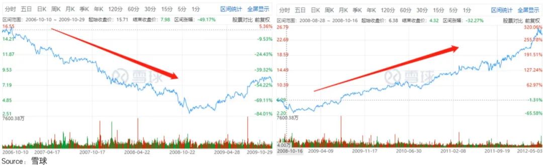 彼時(shí)遭遇經(jīng)營危機(jī)的星巴克,股價(jià)回撤探底持續(xù)了近兩年,從接近16美元,跌到了3.5美元,跌幅近80%。但2009年危機(jī)過后,股價(jià)一路上揚(yáng),到2013年小幅回撤前,漲了近7倍。