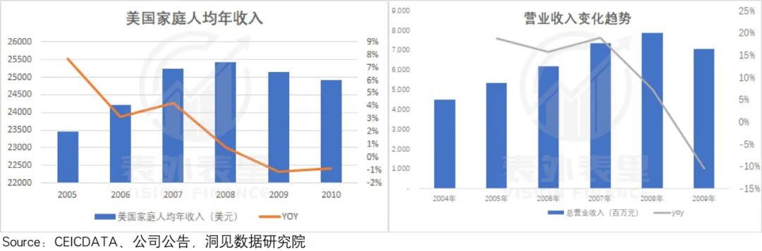最典型的例證是當(dāng)年美國家庭人均年收入開始下滑,而星巴克的營收增速也同期出現(xiàn)大幅下滑。