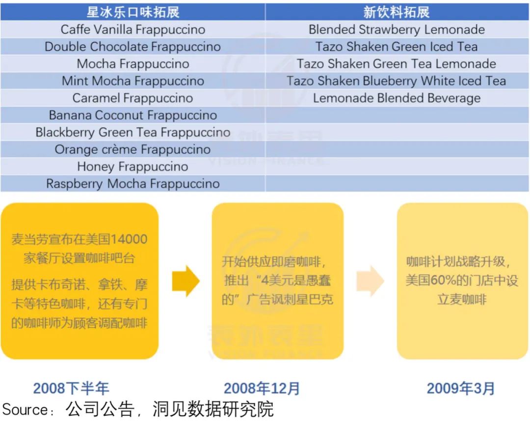 如下圖,2004-2008年,星巴克都囿于曾經(jīng)的爆款星冰樂系列的發(fā)掘;與之相比,麥當(dāng)勞則在咖啡領(lǐng)域,動(dòng)作不斷,甚至依靠高利潤的拿鐵和卡布奇諾咖啡,一舉扭轉(zhuǎn)頹勢。