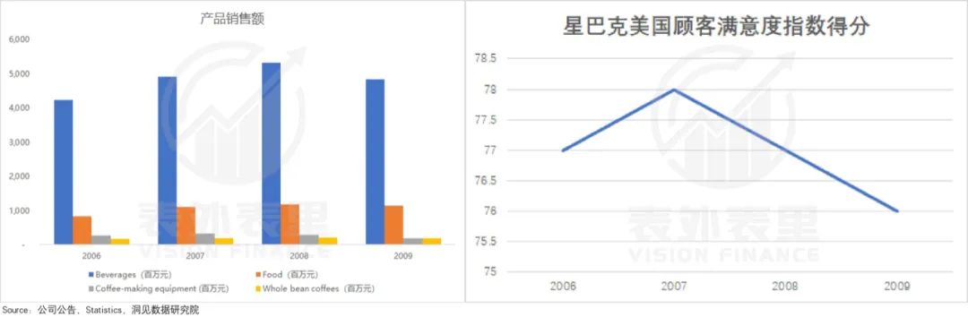 如下圖,2008-2009年,星巴克食物品類的銷量并沒有什么起色;與此同時(shí),其顧客滿意度指數(shù),也不升反降。